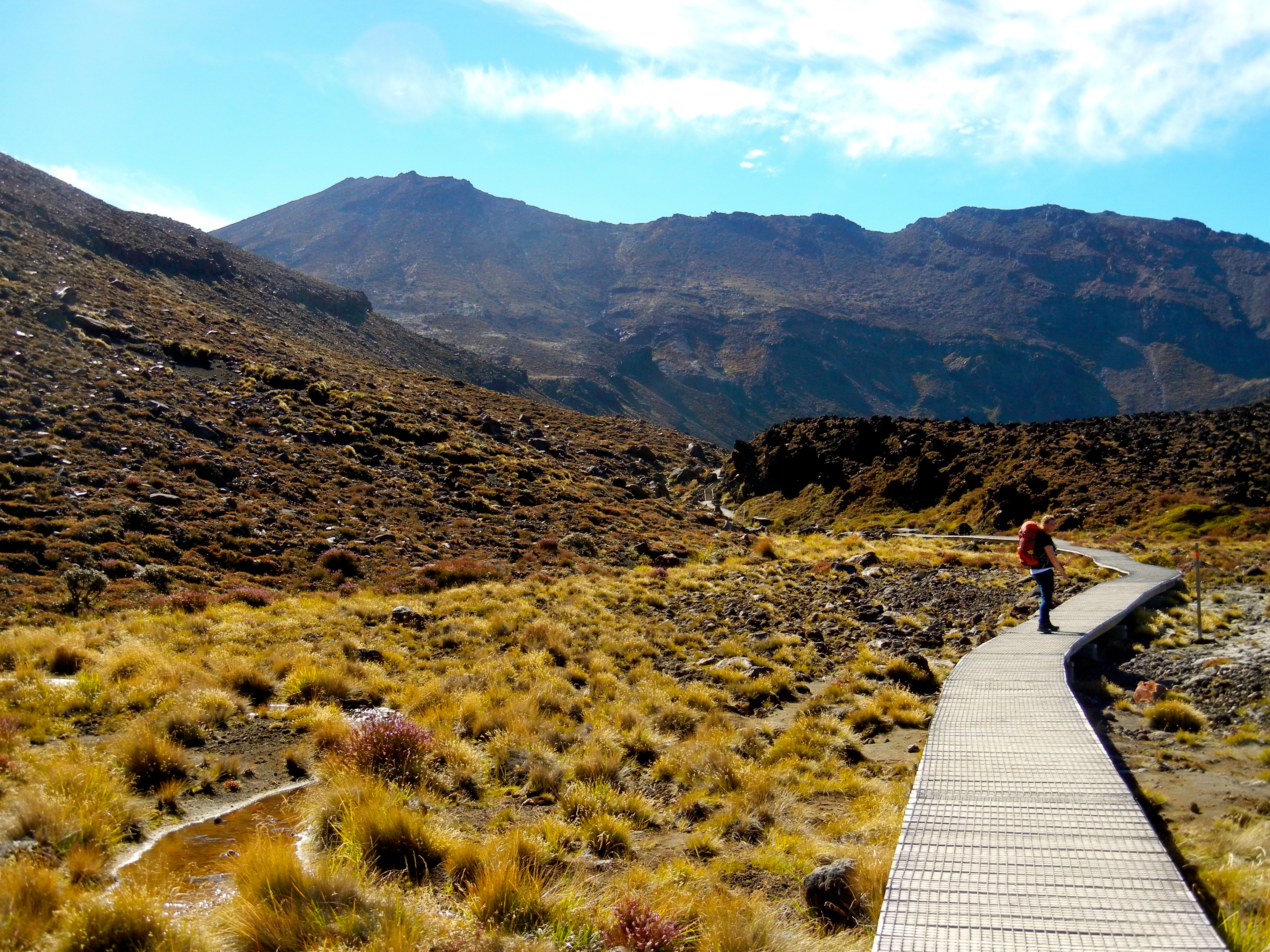 Plötzlich eröffnet sich vor mir eine weite Ebene, den South Crater habe ich nun also erreicht. Ich freue mich, auf das gerade Stück das vor mir liegt. Und auch Anka wartet hier auf mich. Während wir gemeinsam auf dem Weg die Ebene durchqueren, schweift mein Blick immer wieder auf die rechte Seite. Dort ragt nämlich der Kraterkegel des Mt Ngauruhoe herauf. Es gäbe einen Abzweiger um sich wie Frodo hoch zum Krater zu machen. Doch das lassen Anka und ich bleiben. Aber man fühlt sich auch so etwas wie in „Herr der Ringe“. Nur scheint die Sonne für uns in Mordor.