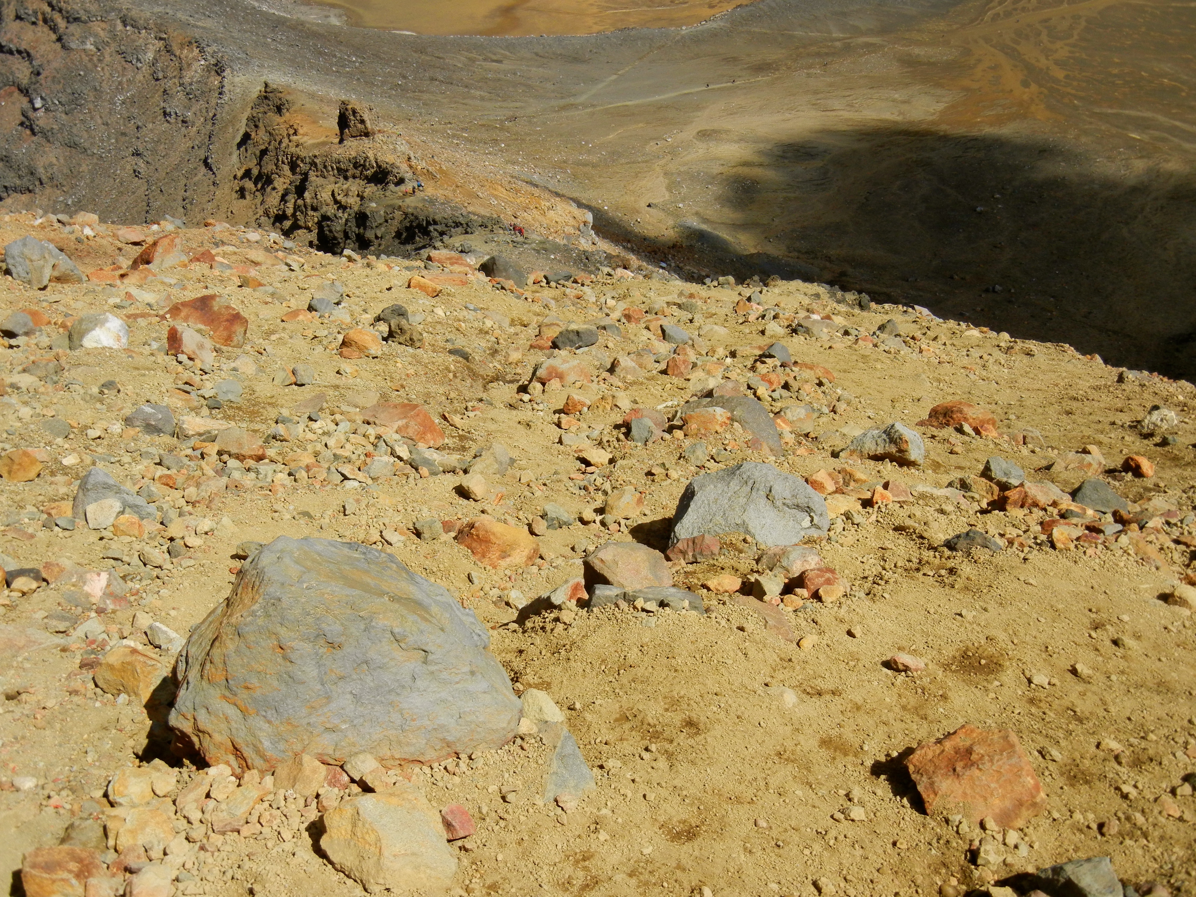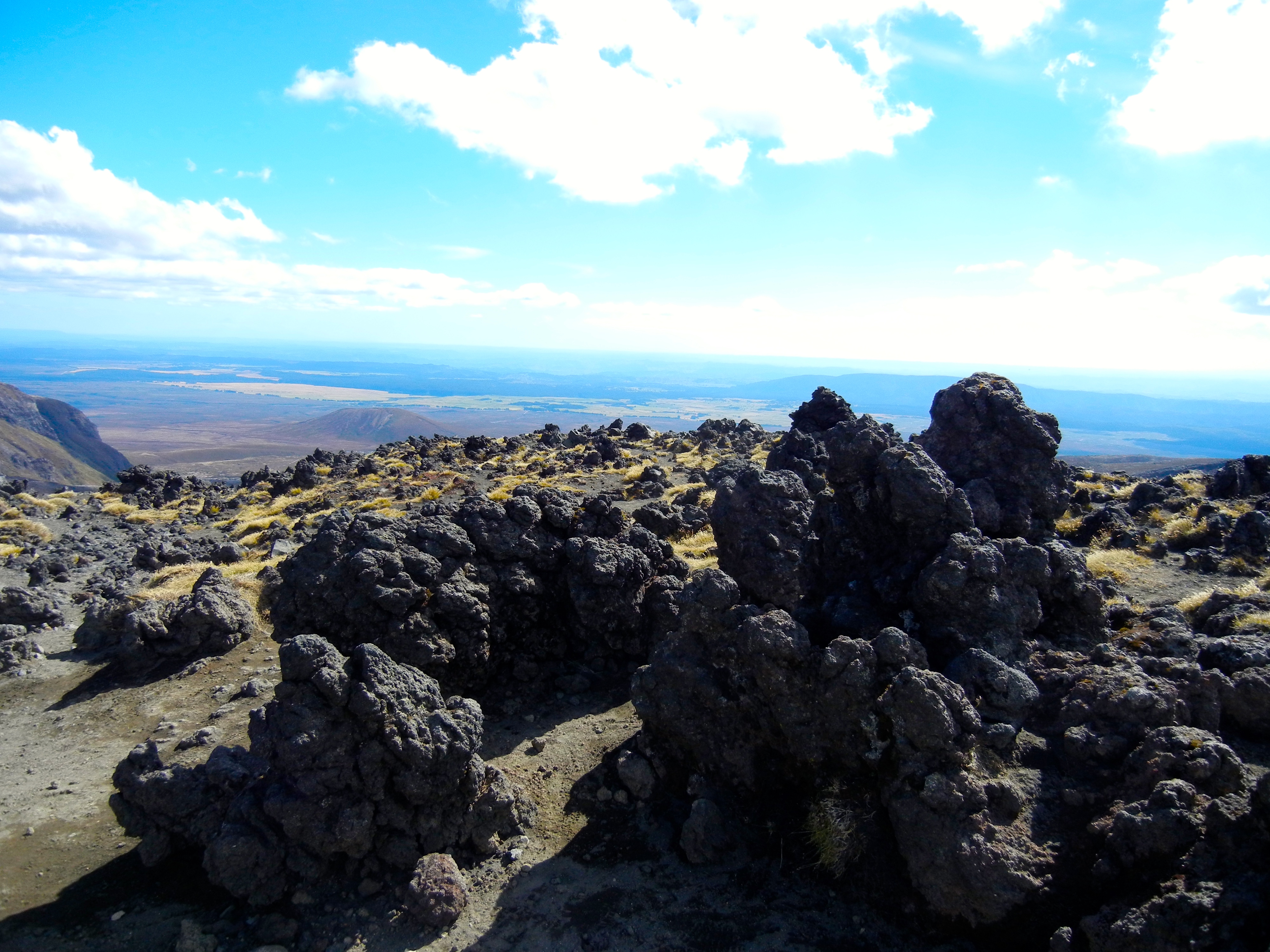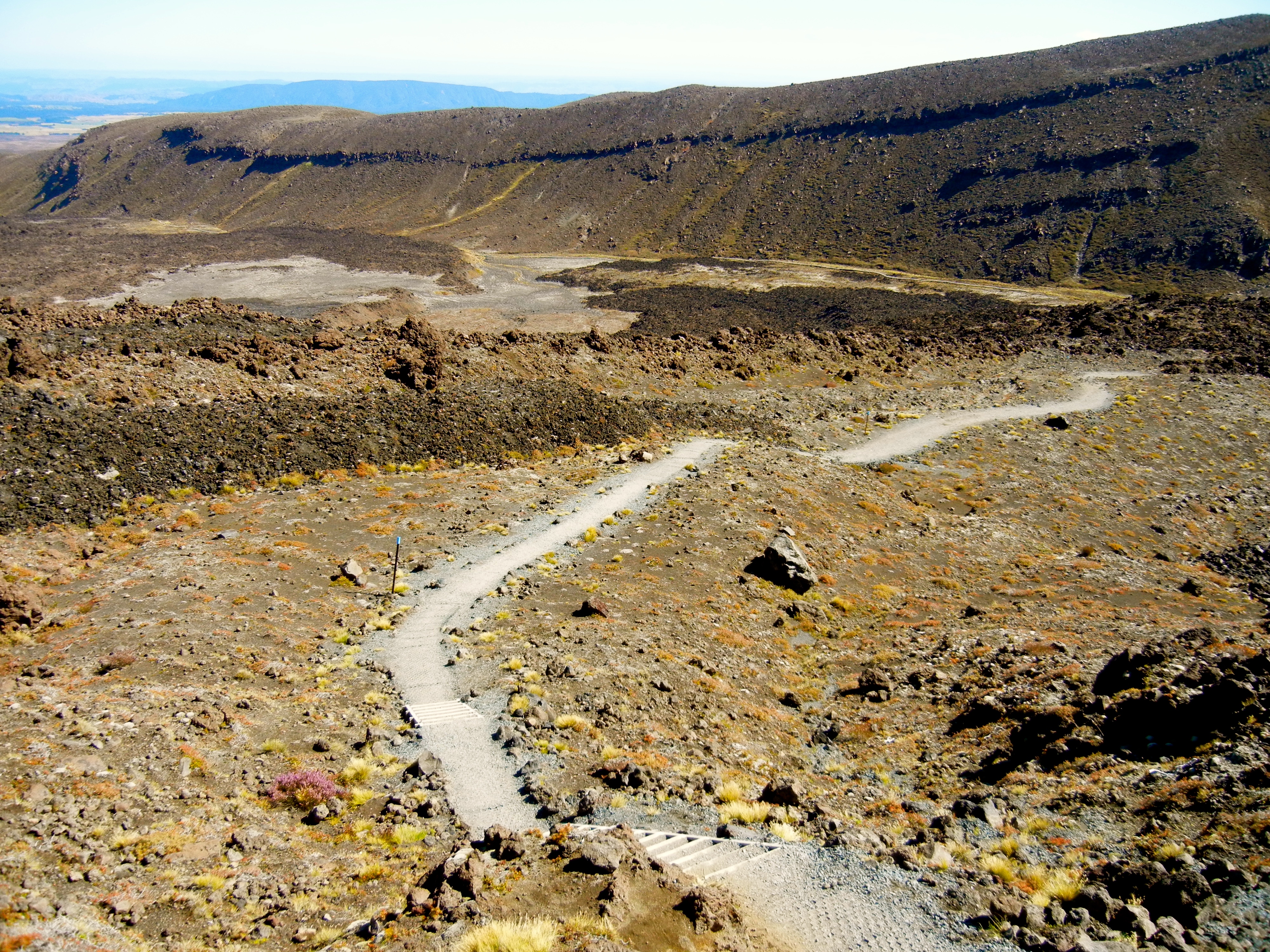 Doch irgendwann nimmt auch diese Etappe ihr Ende. Kurz vor dem Red Crater führt der Weg nochmals durch eine eher flachere Gegend, welche mit Vulkangestein übersäht ist. Anka und ich setzen uns etwas auf die Steine und machen ein kurze Pause. Genügend Wasser mitnehmen ist echt wichtig, wenn man das Alpine Crossing macht.