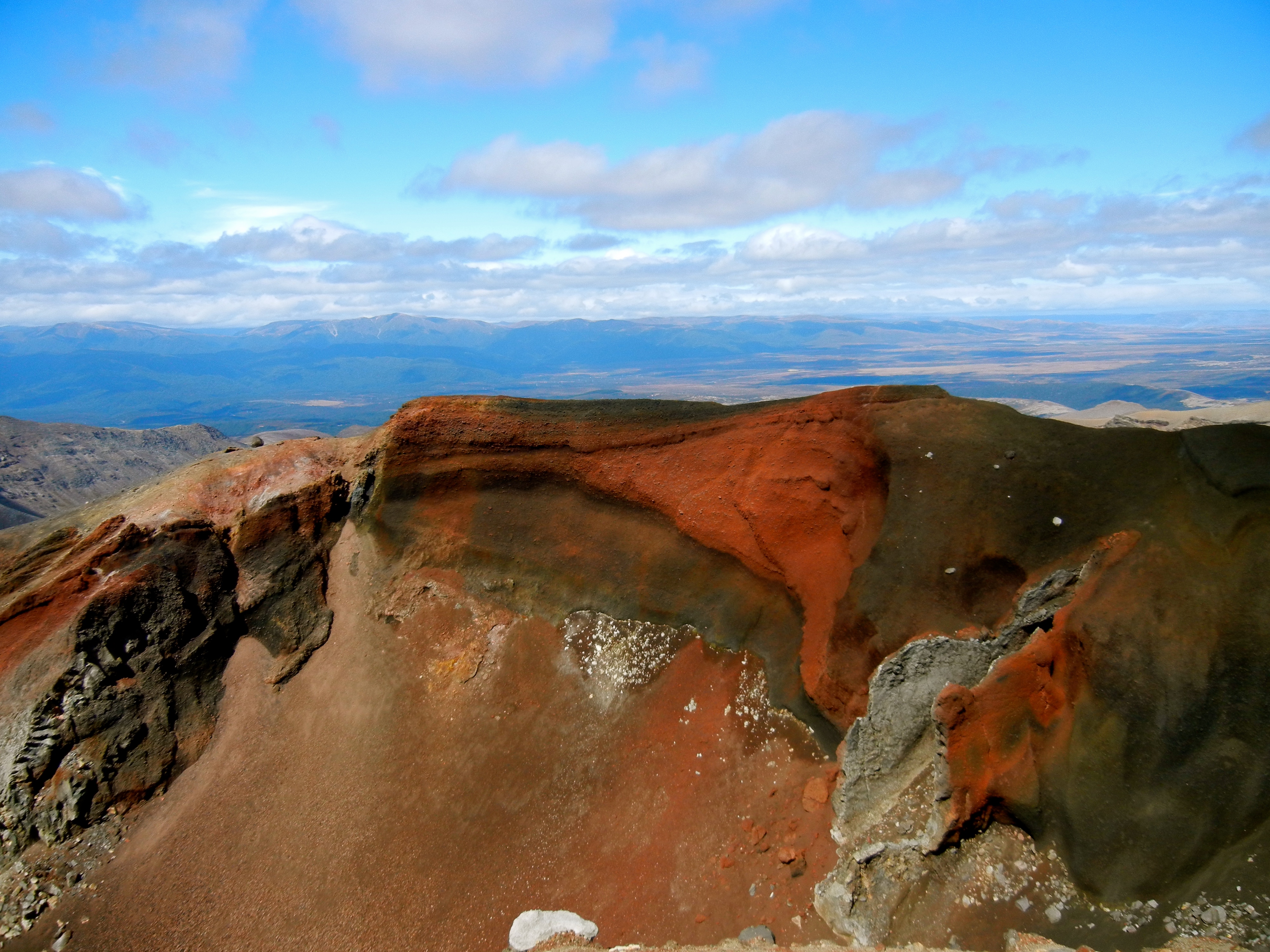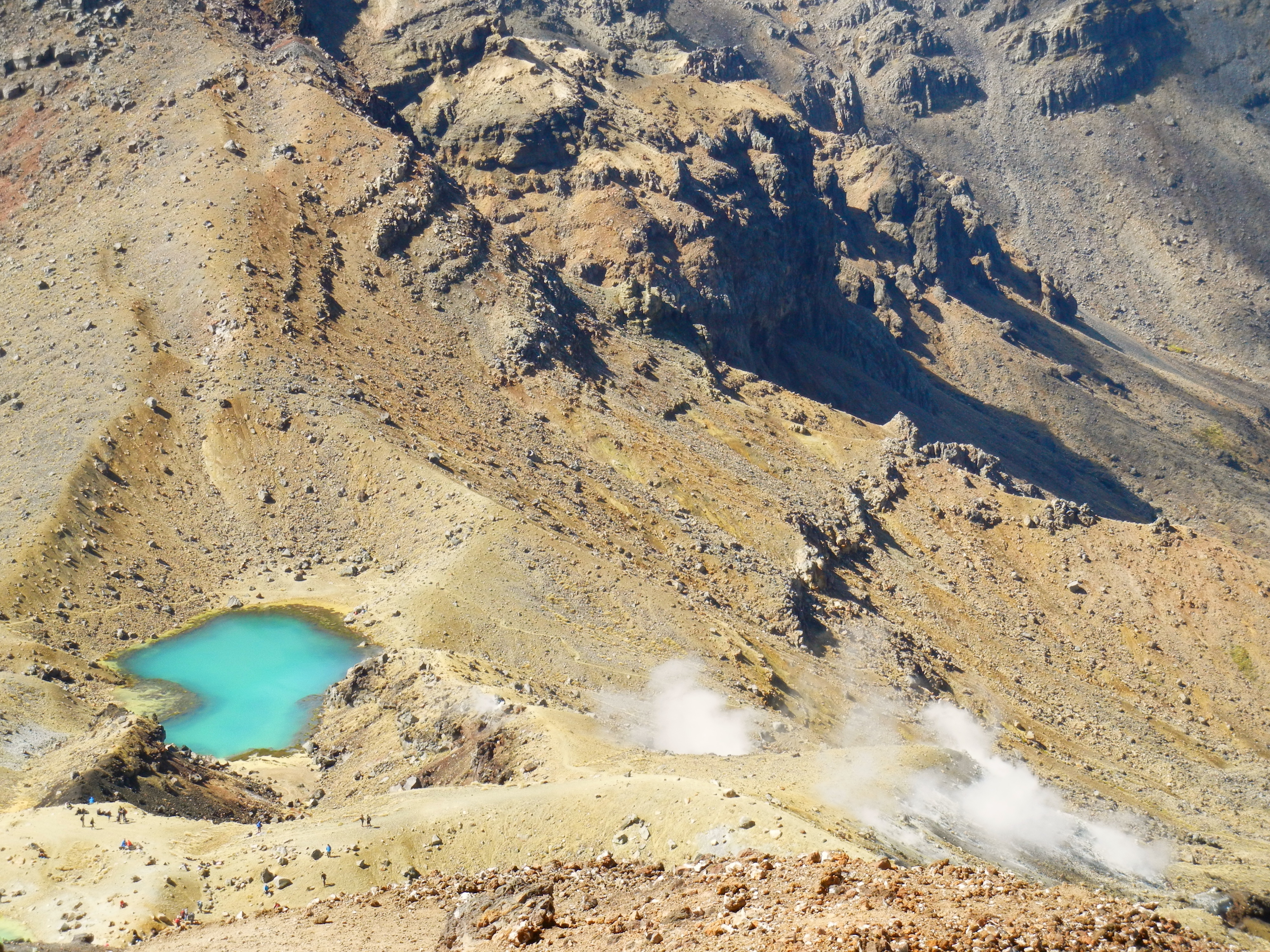 Schliesslich raffen wir uns nochmals auf und gehen unserem heutigen Tagesziel entgegen. Und dann ist es endlich geschafft, wir stehen oben und schauen auf den Red Crater runter. Jegliche Anstrengung ist plötzlich vergessen bei diesem wunderschönen Anblick. Der Krater zeigt sich in verschiedenen Rot-, Schwarz- und Brauntönen. Hie und da raucht es aus der Erde und es riecht nach Schwefel. Im Hintergrund sieht man die türkisfarbenen Emerald Lakes und noch weiter hinten den Blue Lake. Unglaublich was die Natur hier oben so angestellt hat. Wenn man sich über Stunden durch die karge Landschaft gequält hat, ist dieses farbenfrohe Gesamtbild wirklich toll und erweckt Glücksgefühle.