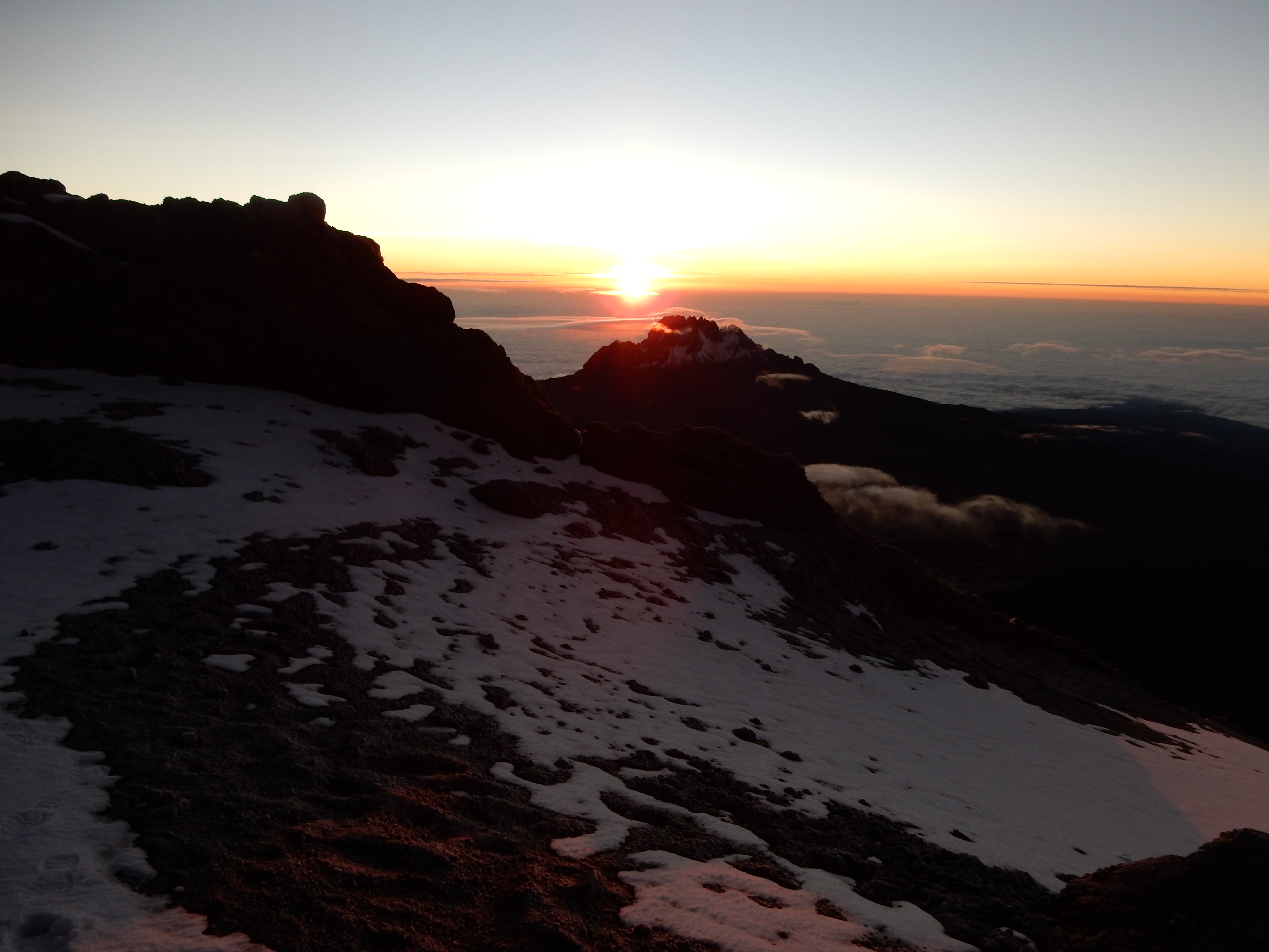 Schliesslich erfüllten freudige Rufe die Nacht. Es war aber noch dunkel und ich traute der ganzen Sache nicht. Es würde wohl noch eine ganze Weile dauern, bis zum Kraterrand. Umso erstaunter war ich, als ich auf einmal oben stand, direkt vor dem Schild, welches mit Gilman’s Point beschriftet war. Ich schaute noch einmal in die Ferne und konnte einen leicht geröteten Horizont erkennen. Augenblicklich schossen mir die Tränen in die Augen. Ich hatte es geschafft! Wenn ich es bis zum Gilman’s Point geschaft hatte, dan würde ich es auch bis zum Uhuru Peak schaffen. Ich setzte mich auf einen Stein und trank Tee während ich mich wieder sammelte. Wir umarmten und gratulierten uns gegenseitig. Alle aus meiner Gruppe hatten es geschafft!