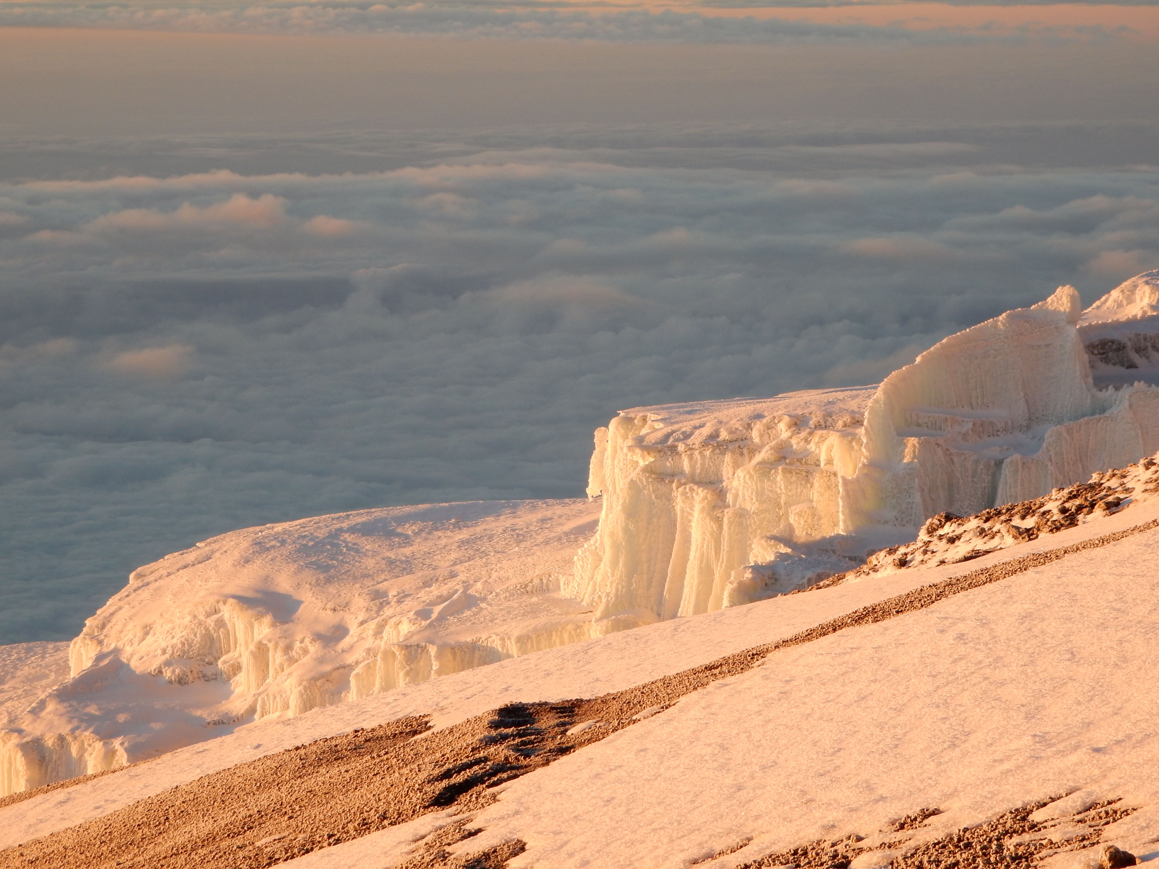 Um Mitternacht starteten wir die letzte Etappe. Der Weg führte durch steiles, felsiges Gelände hoch zum Gilman’s -Point (5715 m). Schliesslich erreichten wir über den mit Schnee gesäumten Weg am Kraterrand entlang den Uhuru Peak (5895 m).