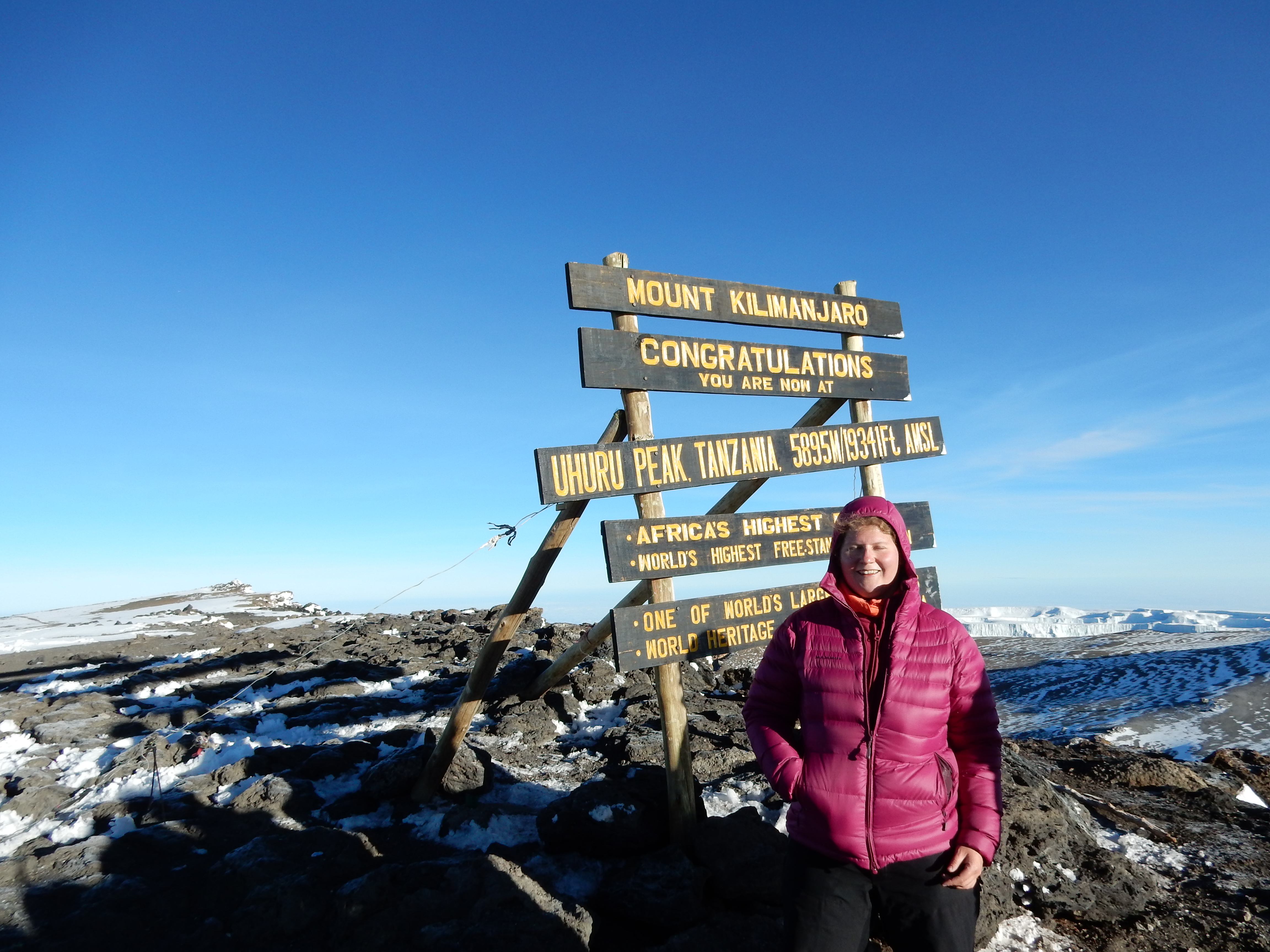 Vor uns lag aber noch ein beträchtlicher Weg und die Führer drängten zum Aufbruch. Viele hatten mit Kopfschmerzen und Übelkeit zu kämpfen. Mir schien die Höhe aber gar nichts aus zu machen, nur der Sauerstoffmangel war anstrengend. Deshalb nahm ich es auch gemütlich. Ich machte immer wieder Pausen, um die Momente in mir aufzunehmen und Fotos vom Sonnenaufgang und den Gletschtern zu machen. Weder Fotos, noch Beschreibungen kommen annähernd an das Erlebte heran. Livingstone blieb bei mir, während die anderen aus meiner Gruppe weiter gingen. Gemächlich und doch schwer atmend, setzte ich meine Schritte am Kraterrand entlang fort. Es wurde immer heller und schliesslich erreichte ich bei strahlendem Sonnenschein den Uhuru Peak auf 5895 Metern. Gerade rechtzeitig für das Gruppenfoto, erreichte ich den Gipfel des Kilimanjaro. Die Zeit dort oben war sehr kurz. Nach weiteren Gratulationen, Umarmungen und Tränen, machte ich mich als Letzte wieder voller Freude, Zufriedenheit, Dankbarkeit und Stolz an den Abstieg.Der harte Weg bis ganz nach Unten