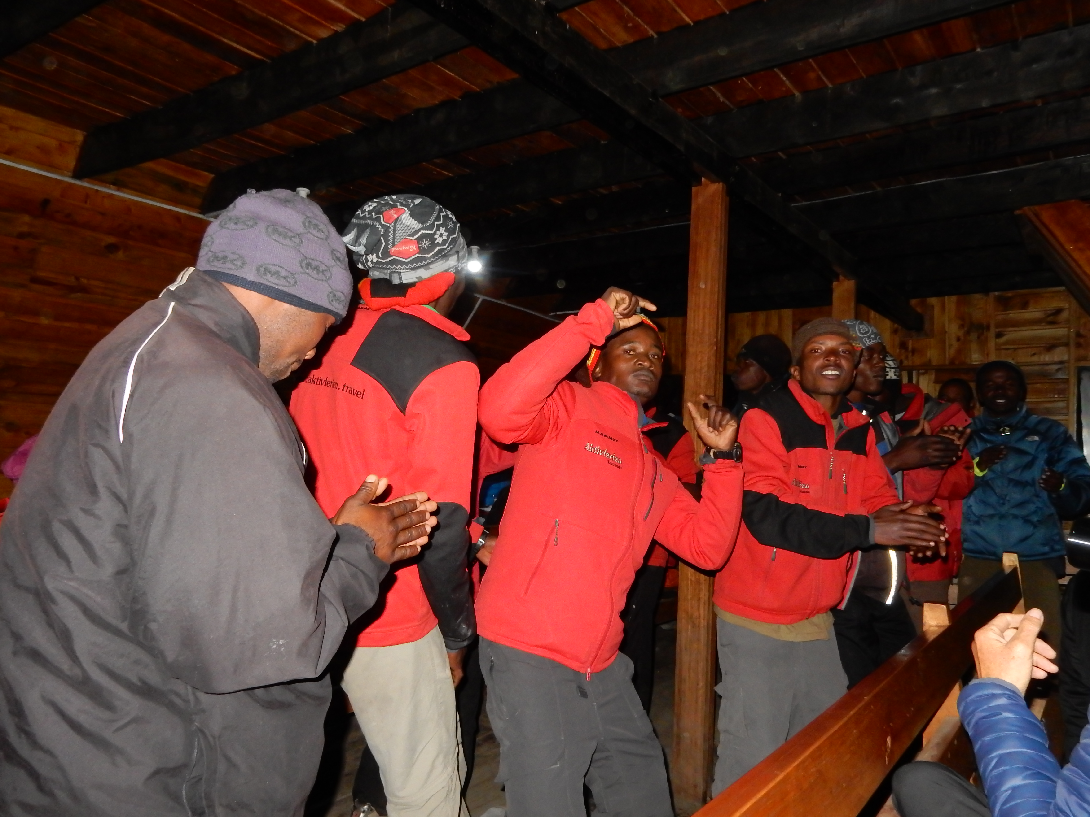 Zum Abendessen waren alle wieder ziemlich fit. Nach einem leckeren Essen, überraschte uns das Küchenpersonal mit Klimanjaro-Besteigungs-Torten. Die tansanischen Führer und Träger tanzten und sangen einmal mehr für uns und wir alle liessen uns von dieser tollen Stimmung mitreissen.