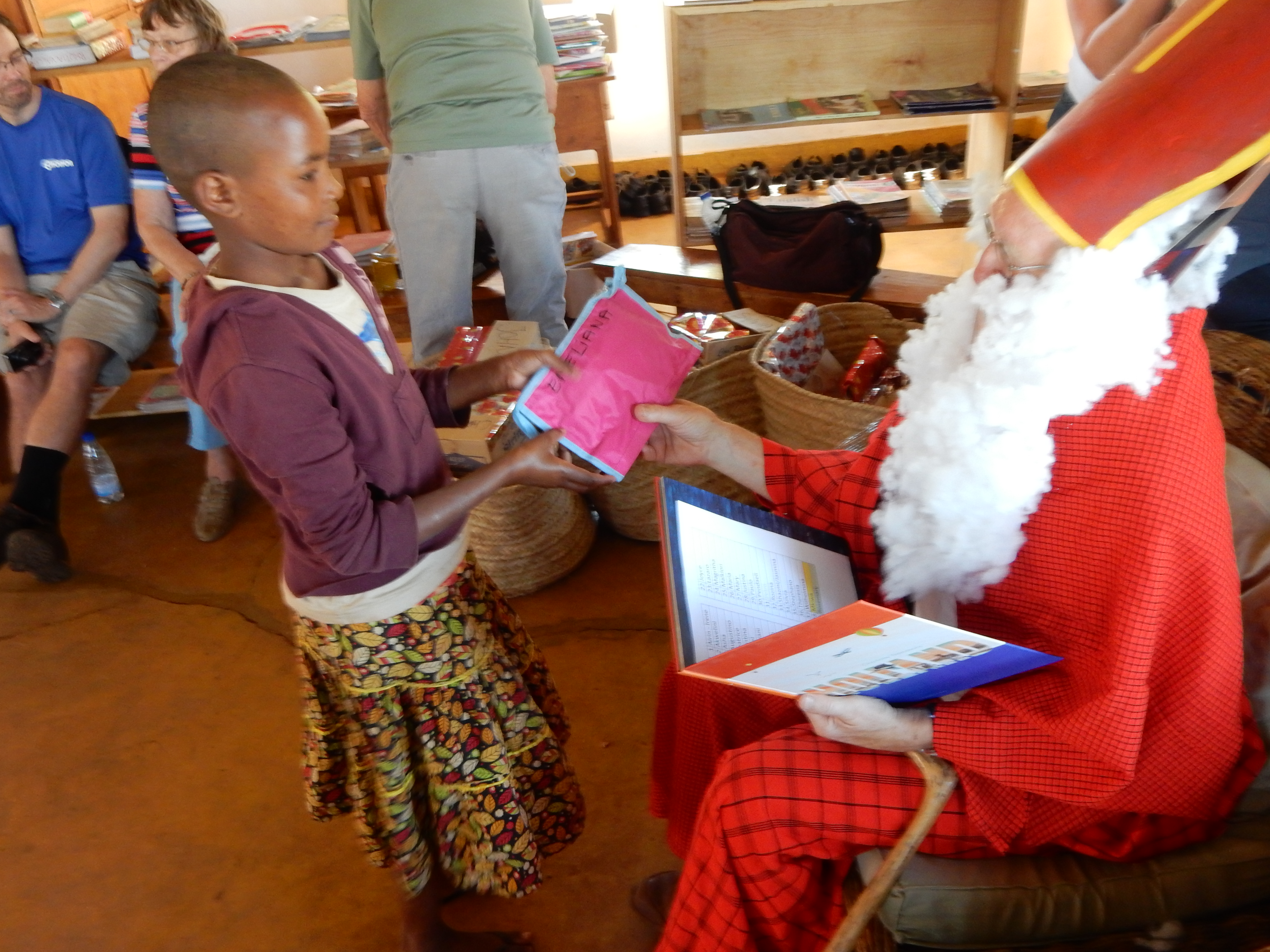 Das erste wichtige Datum war der 5. Dezember. An diesem Tag feierten wir nämlich den St. Nikolaus, so wie es in Holland der Brauch ist. In Holland werden die Geschenke vom Nikolaus gebracht und nicht vom Christkind. Deshalb haben wir bereits Tage davor damit begonnen, für alle 37 Kinder Geschenke vorzubereiten. Nach diversem Umsortieren lagen dann 37 Päcken in Korb bereit. Baba Joris hatte sich als Samichlaus (Nikolaus) verkleidet und den Kinder von seiner langen Schiffsreise von Europa nach Afrika erzählt.