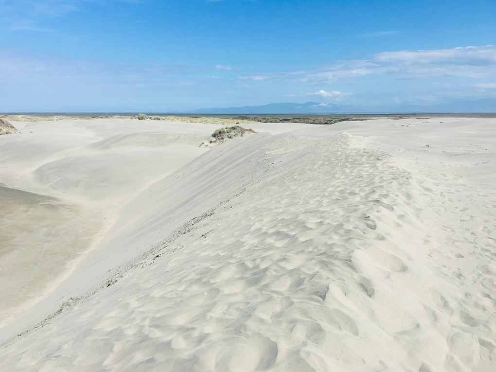 Einmal mehr zeigte sich Neuseeland in einer ganz neuen Form. Von den mit Gras bewachsenen Klippen, welche ins Meer mündeten, folgte eine immer kargere Landschaft. Das wilde Meer immer im Blick, zeigten sich die ersten Sanddünen, welche nicht enden zu sein schienen. Bestieg man eine grössere Sanddüne, konnte man von der einen Meerseite zur anderen blicken. Nebst den unterschiedlichen Wasservögel, sassen da auch Robben und liessen ihre Bäuche in der Sonne wärmen.