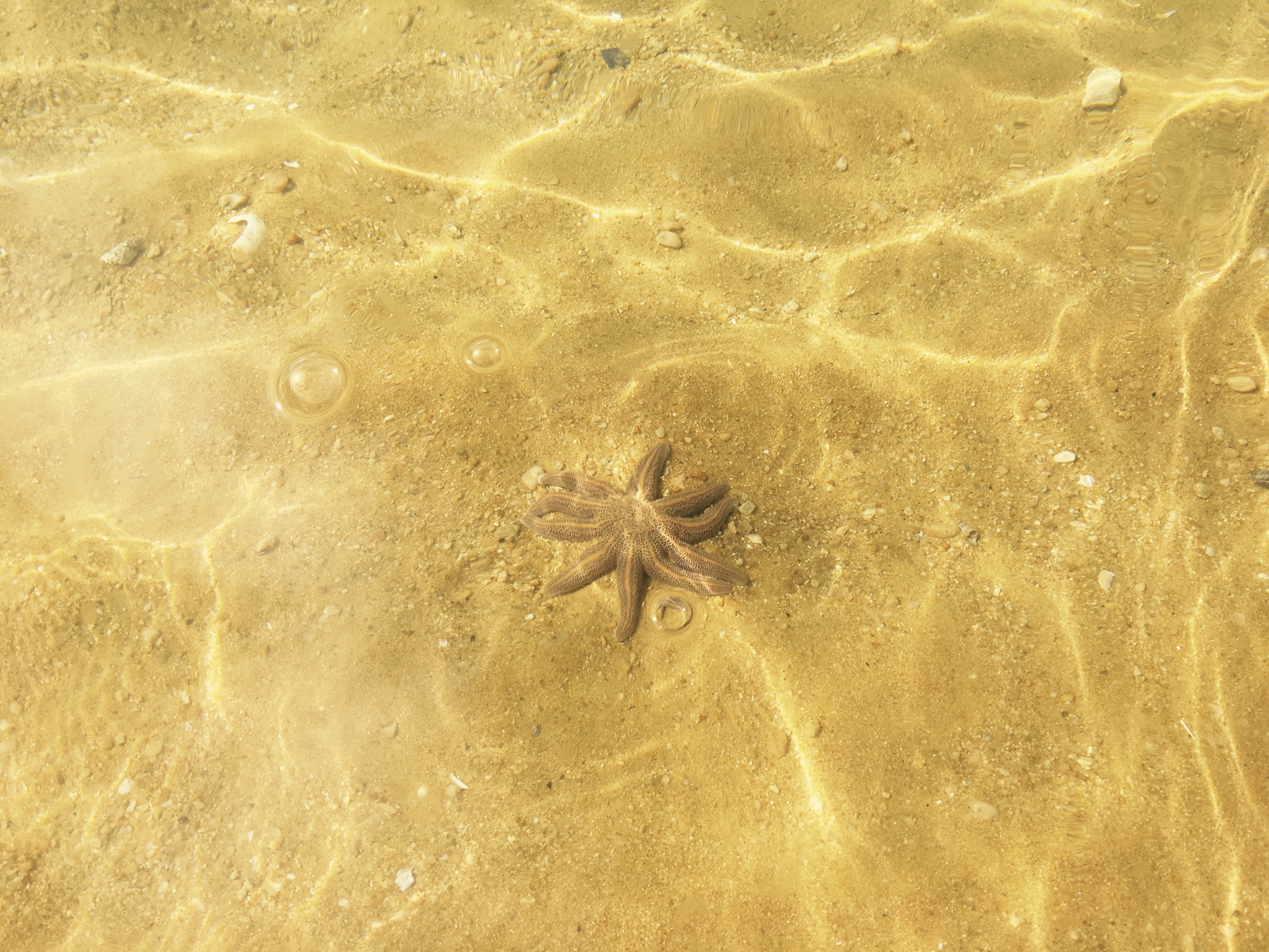 Vermutlich hatte ich ziemlich Glück, an dem Tag, als ich mich über einen Trampelpfad zum Strand des Split Apple Rocks machte. Es war warm und tolles Wetter. Das klare Wasser lockte mich, ein Bad zu nehmen. Und ich musst den Strand nur einzig und alleine mit einem Seestern teilen. Diesen bemerkte ich, als ich mich ins Wasser begab. Ich war ziemlich fasziniert von ihm, denn so oft habe ich noch nicht Seesterne im offenen Meer gesehen. Nur ganz langsam bewegte er seine Arme über den Meeresboden. Hie und da liess er eine Luftblase emporsteigen. War er auf Futtersuche? Ich weiss es nicht. Vielleicht liess er auch einfach so wie ich, die Seele baumeln. In tieferem Gewässer drehte ich mich auf den Rücken und liess mich von den sanften Wellen dahintreiben. Einfach paradiesisch!