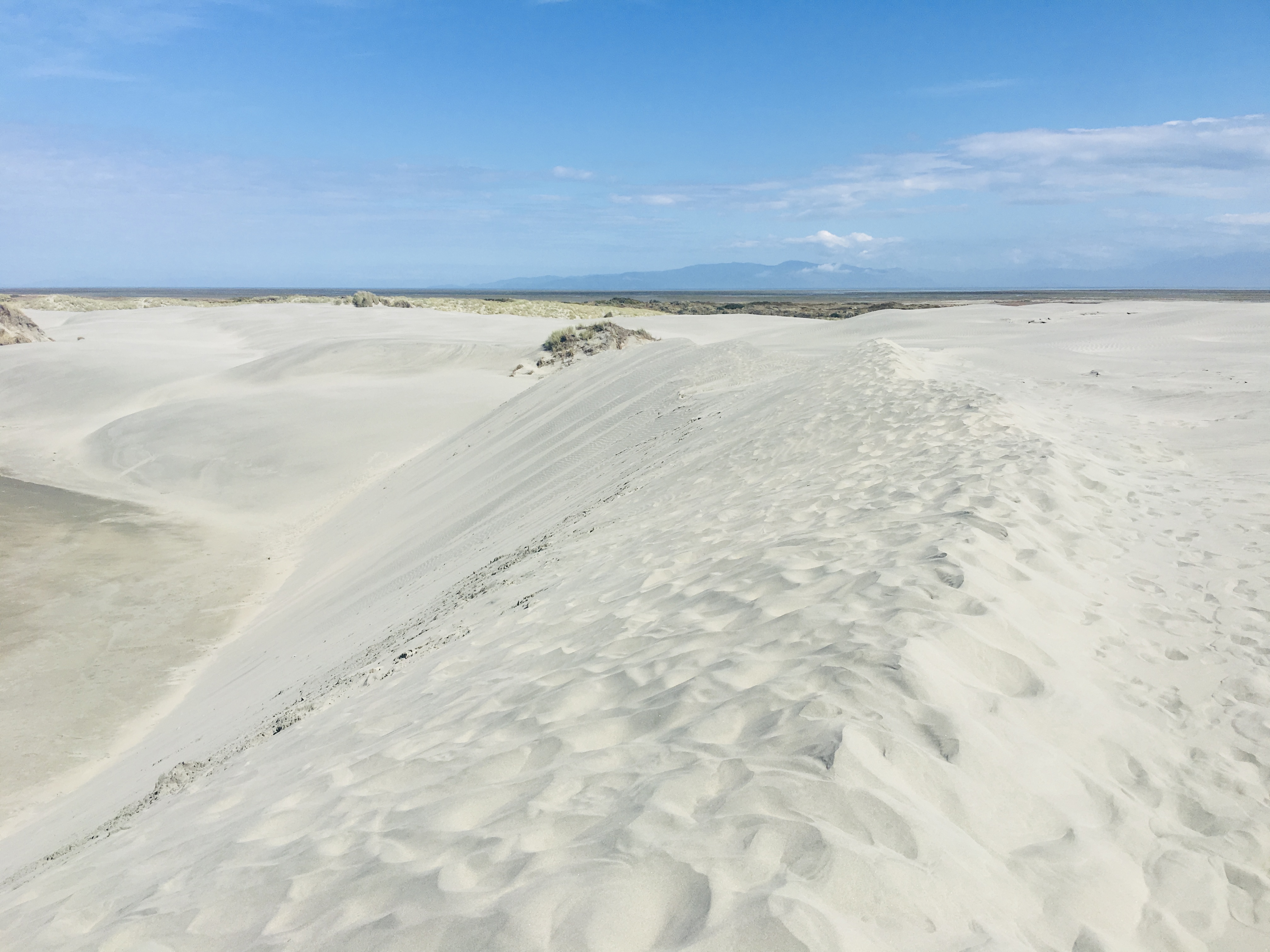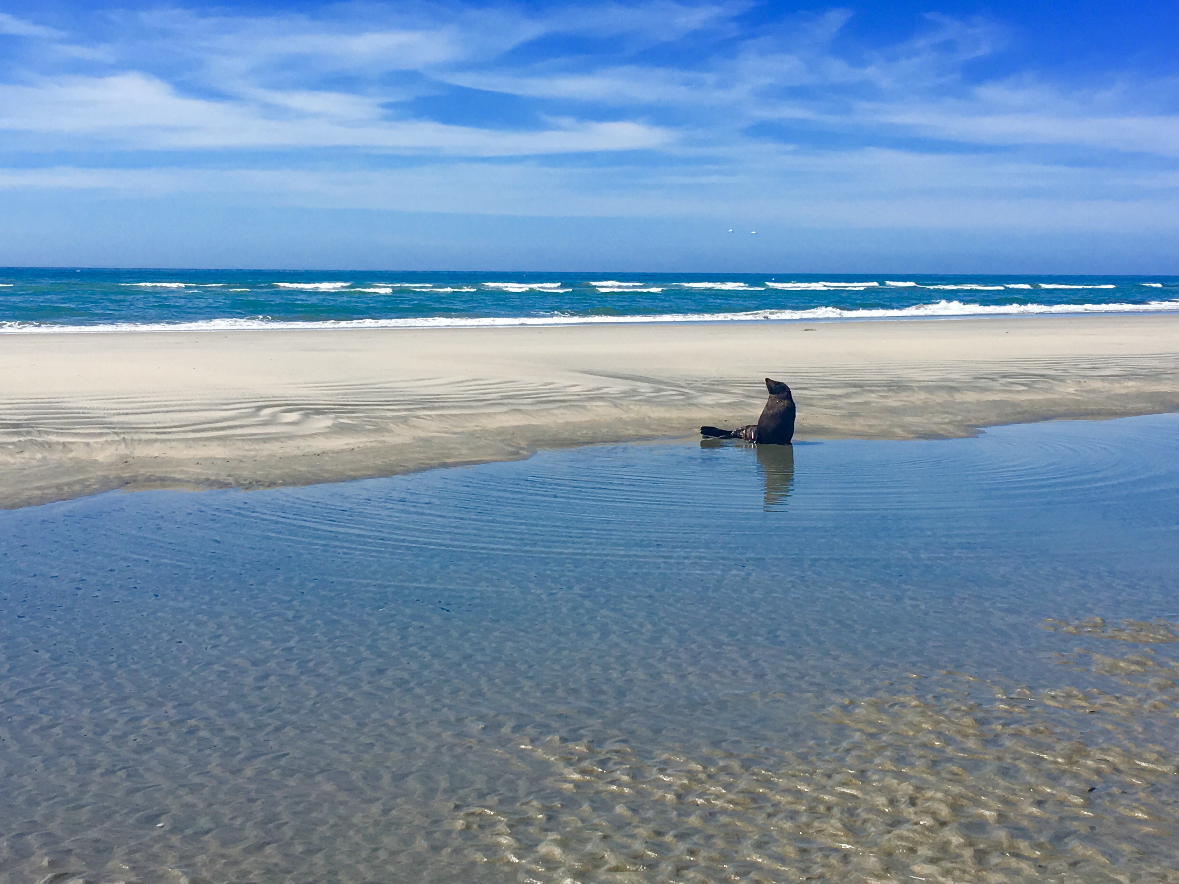 Einmal mehr zeigte sich Neuseeland in einer ganz neuen Form. Von den mit Gras bewachsenen Klippen, welche ins Meer mündeten, folgte eine immer kargere Landschaft. Das wilde Meer immer im Blick, zeigten sich die ersten Sanddünen, welche nicht enden zu sein schienen. Bestieg man eine grössere Sanddüne, konnte man von der einen Meerseite zur anderen blicken. Nebst den unterschiedlichen Wasservögel, sassen da auch Robben und liessen ihre Bäuche in der Sonne wärmen.